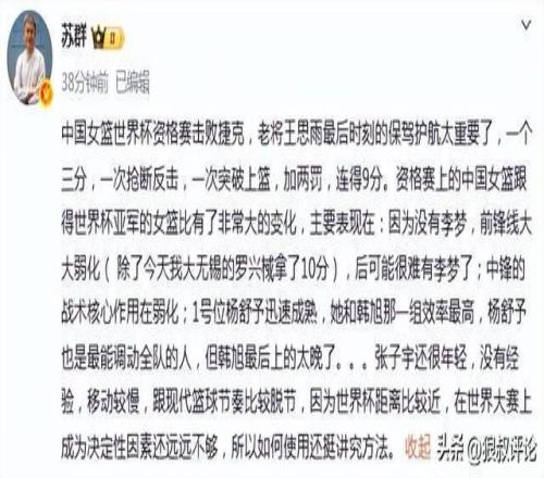 赛后,知名媒体人苏群发文点评: