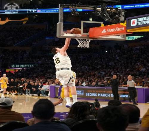 最后15.1秒,约基奇打进,追平。湖人前场边线球,东契奇面对夹击,底线中距离后仰命中,留给掘金0.5秒。